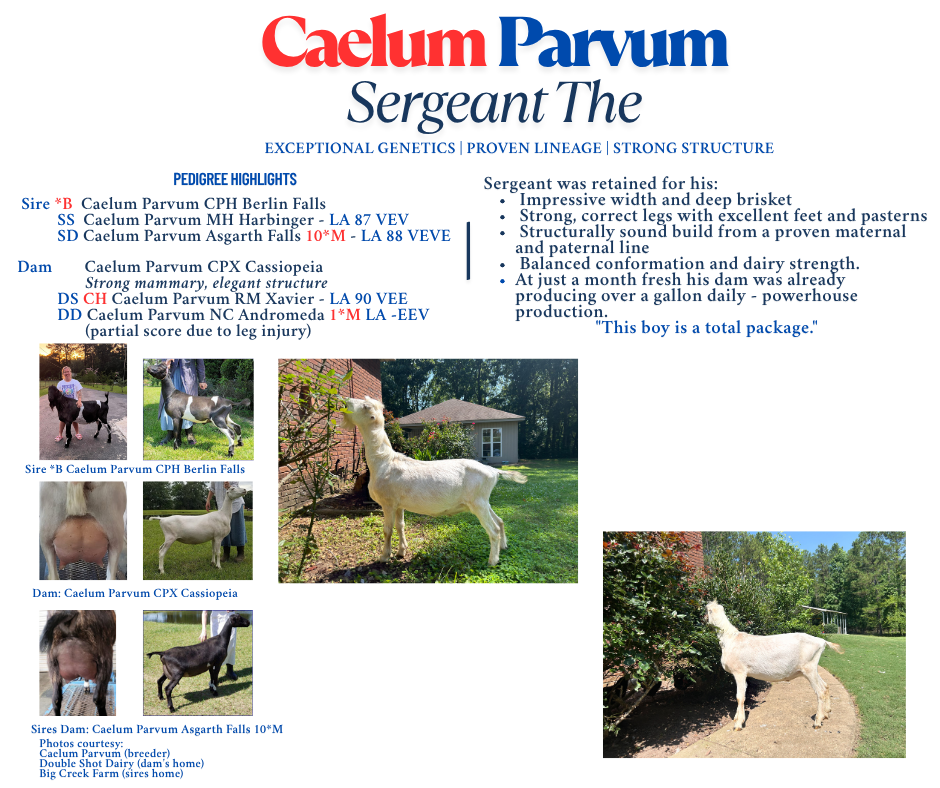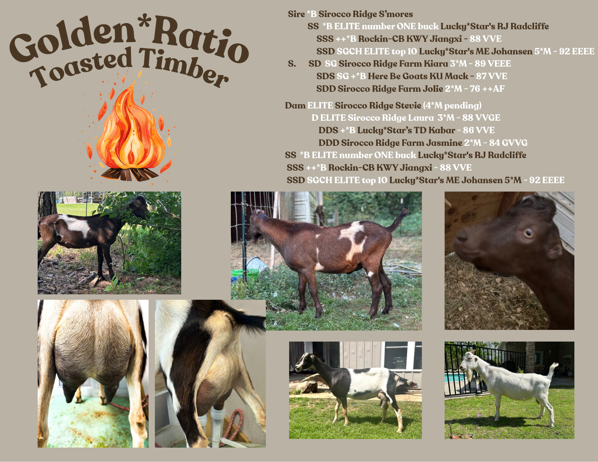 Toasted Timber’s pedigree is packed with exceptional lineage. His dam made the ELITE list and his grand sire, on both sides, is the number one ELITE buck and TOP 3 PTI & ETA. Timber is wide and long, built like his dad, with great legs, well put together front end assembly, wrinkly skin, and over all a strong dairy buck. He is a special buck, kept as backup genetics to his sire. He won’t be helping our herd and because of this we know he’ll make a spectacular herd sire. Timber is easy going, friendly and willing to have hoof’s trimmed, even in rut. He does have a scur that needs occasional trimming. If he goes with his buddy, Caelum Parvum CPB Sargent The, I’ll take $100 off. Both of these boys would be phenomenal in a show ring.